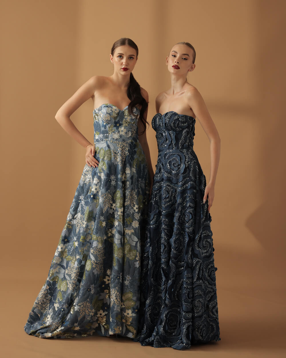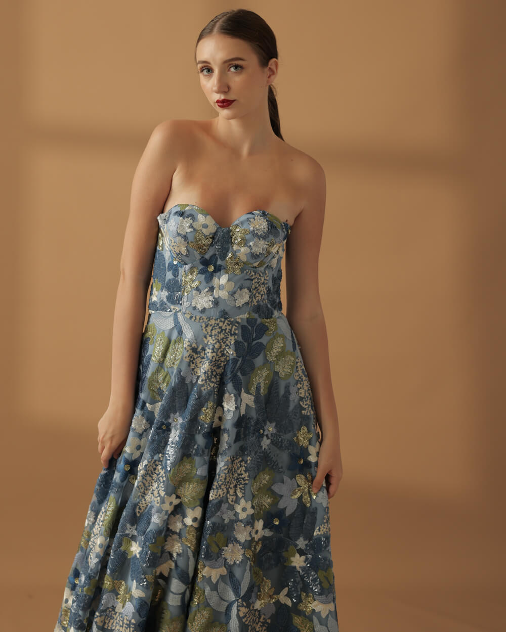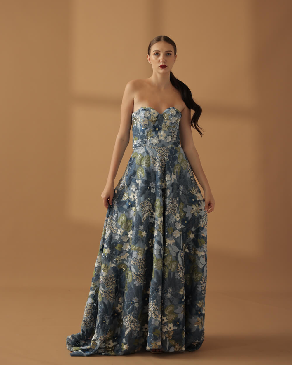 Tags: Blue Gown, Bustier, Corset, Embellished, Fall 2025, Floral, Full bias cut skirt, Lace
