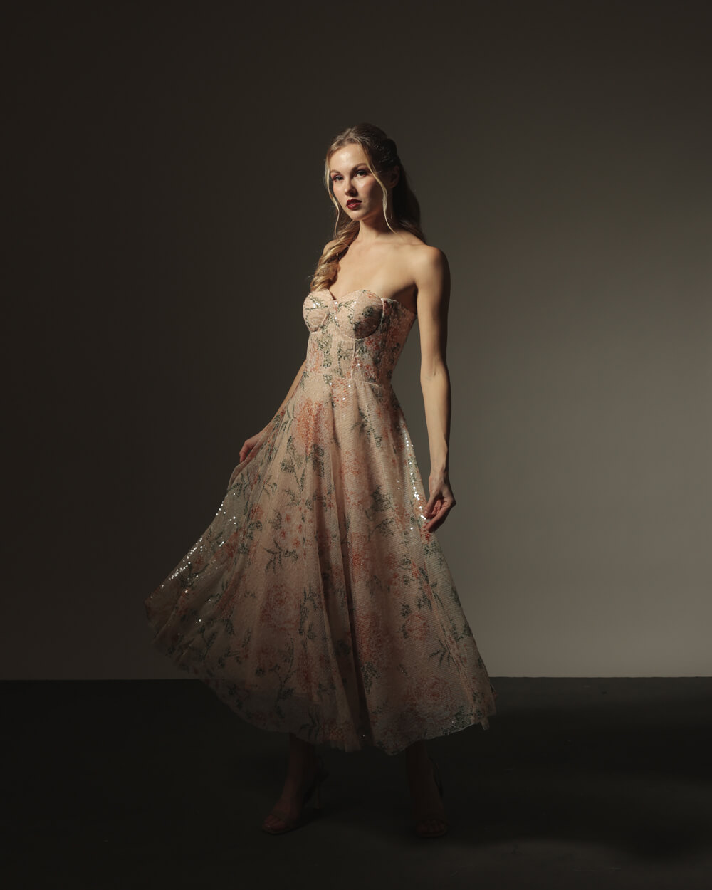 Tags: Beaded, Bias cut skirt, Bustier, Cocktail Dress, Corset, Embellished, Floral, Holiday Collection, La Fleur, Midi Dress, Peach, Sequin