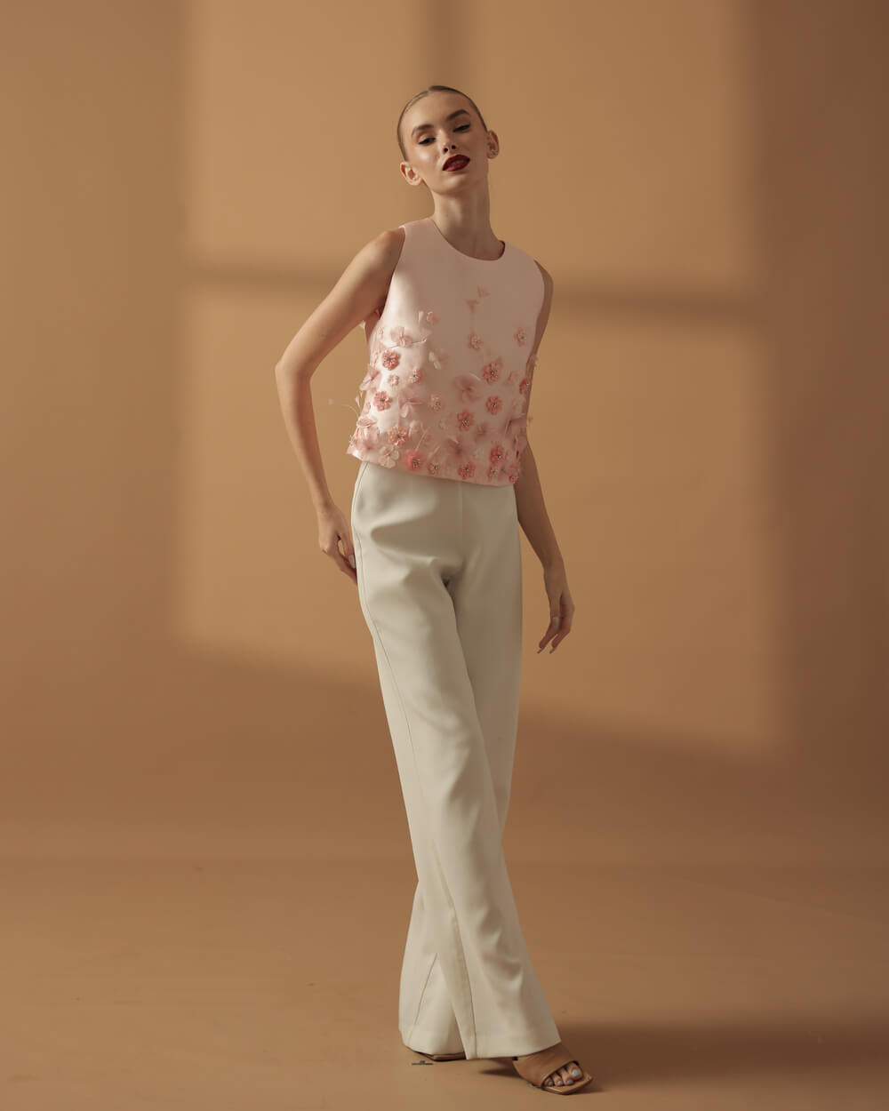 Blush Mikado silk semi-haltered top embellished with 3d floral appliques and feathers