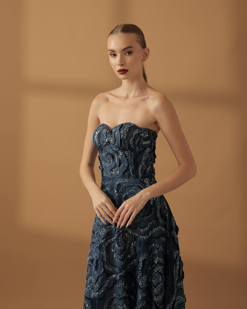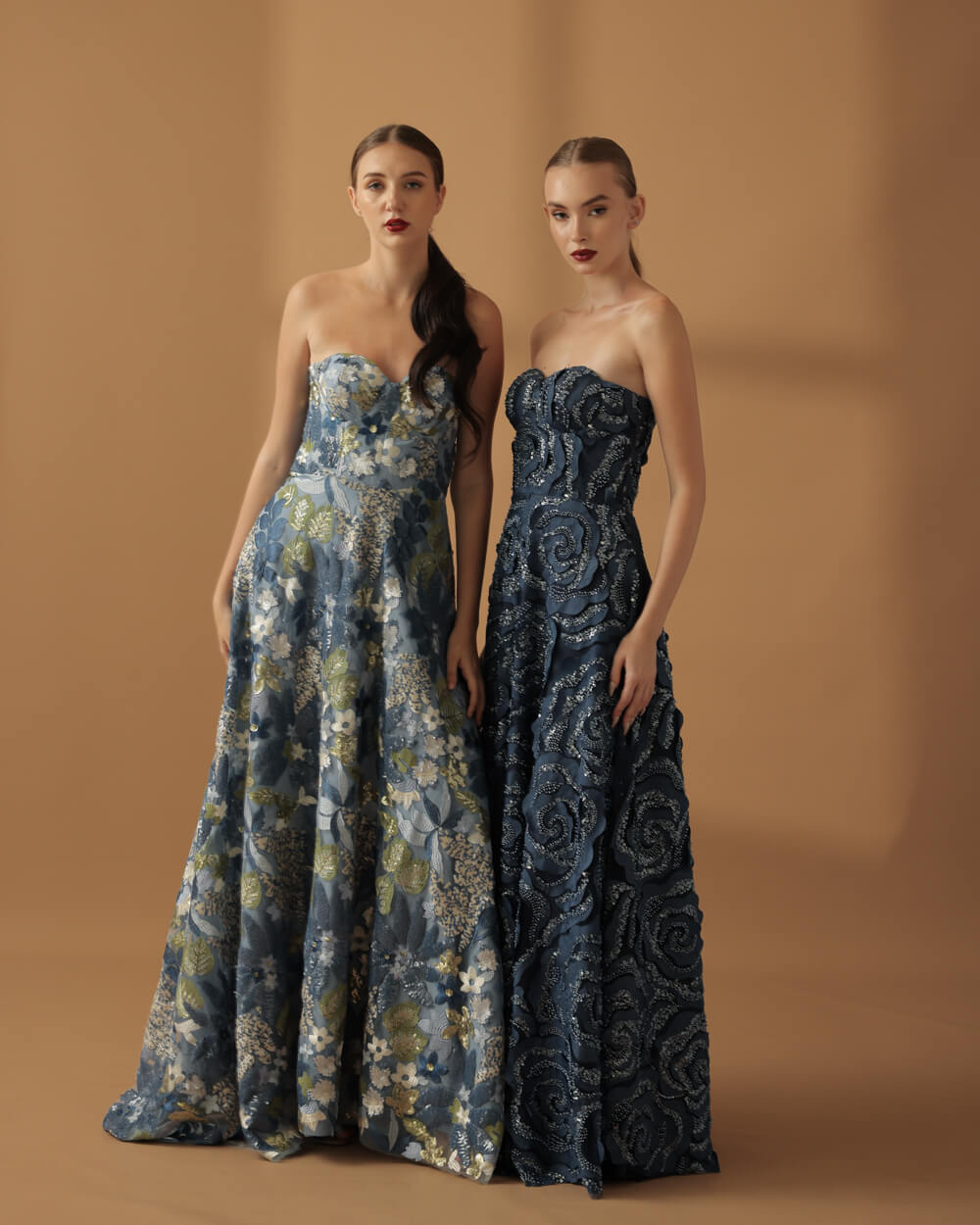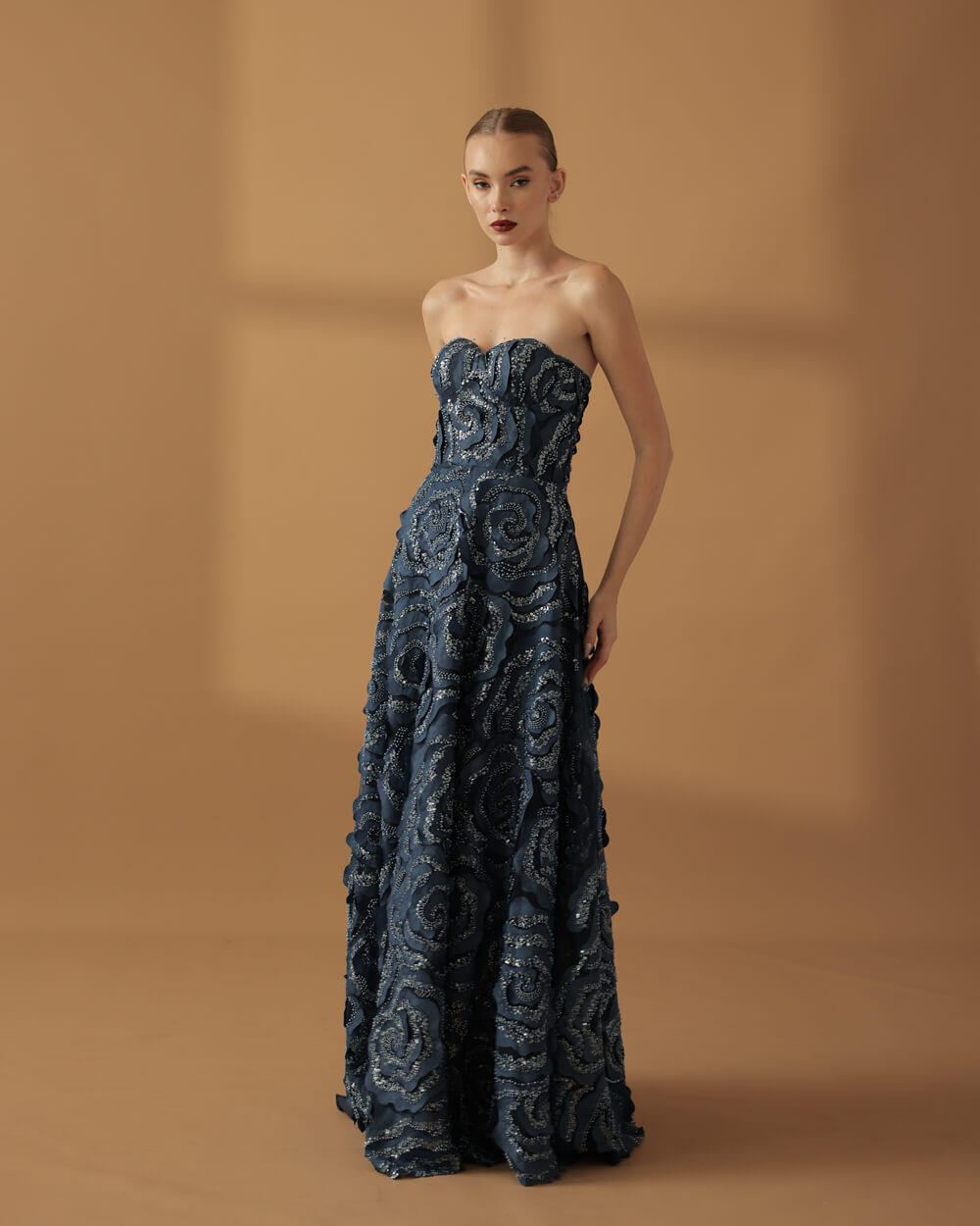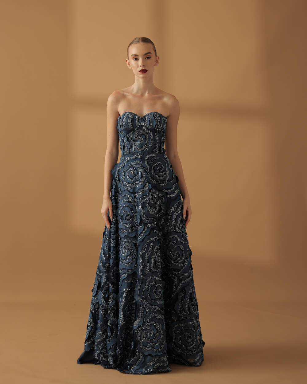 Tags: Bias cut skirt, Bustier, Corset, Fall 2025, Fall Collection, Floral, Flowers, Lace, Long Gown, Midnight Blue, Navy gown, Rosette