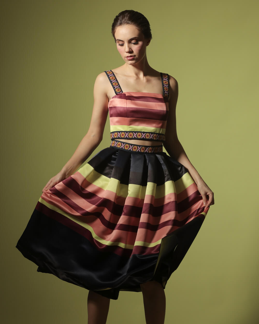 Multi-coloured stripe satin coordinated corseted cropped top with trimming details with box pleated midi skirt