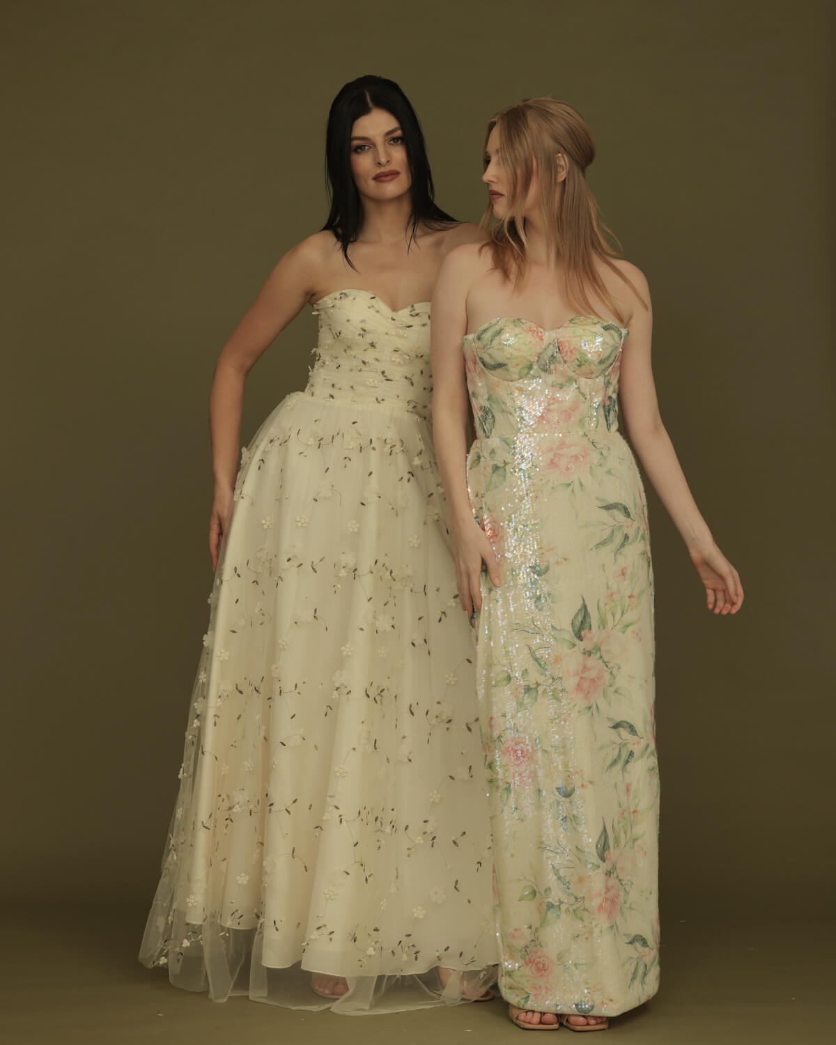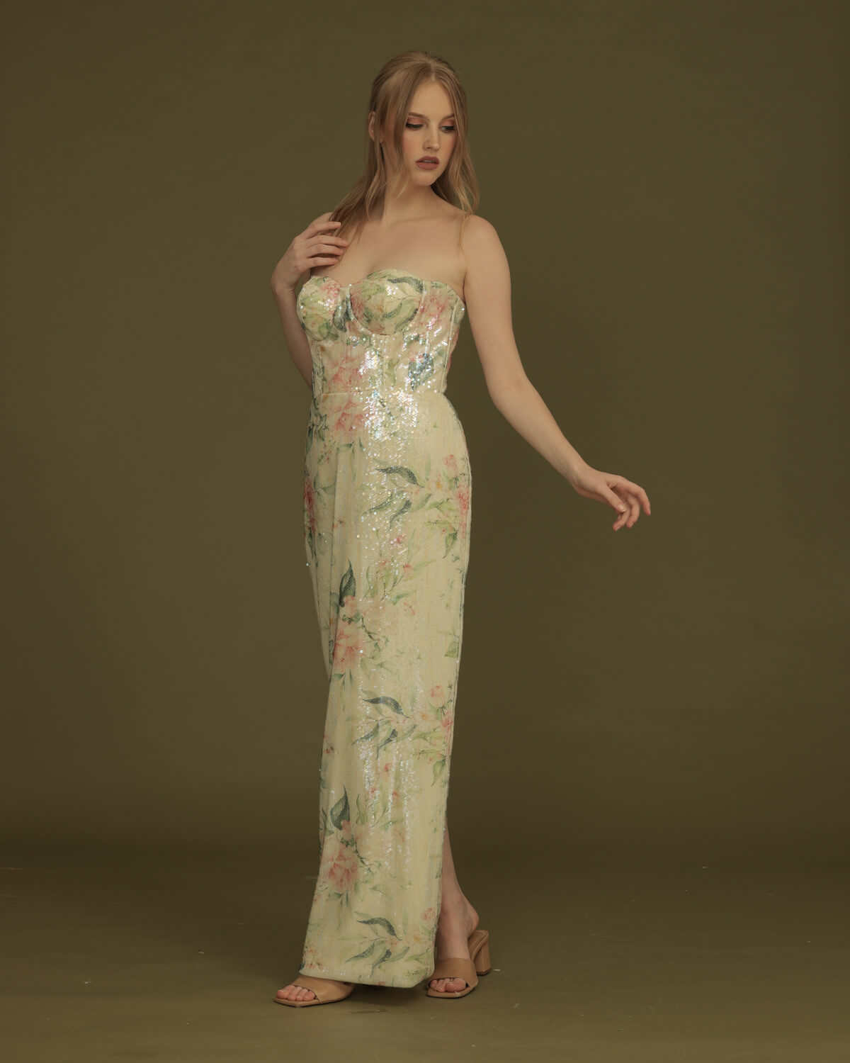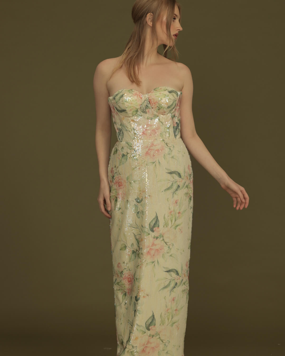 Tags: Beaded, Bustier, Corset, Cream, Cream Gown, Embellished, Floral, Holiday 2024, Holiday Collection, Long Gown, Sage, Tube