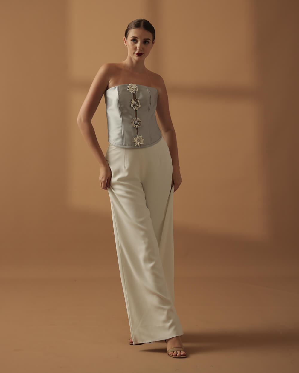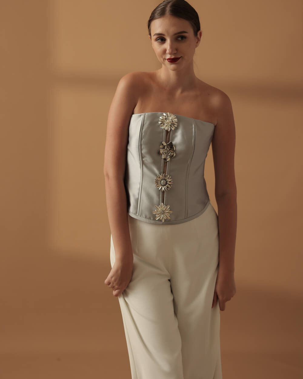 Silver Mikado silk corseted bustier top embellished with silver flowers