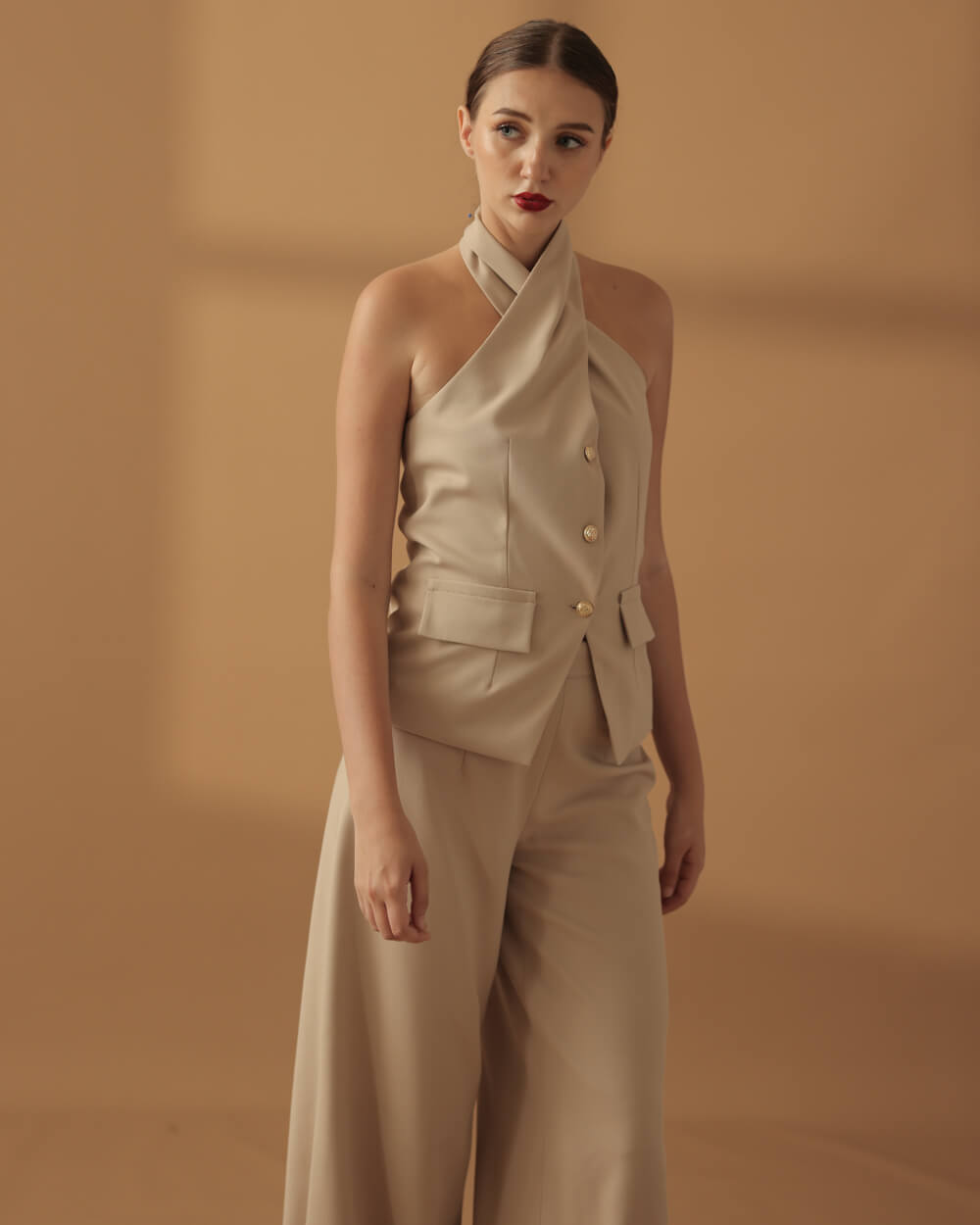 Tags: Coordinates, Coords, Fall 2025, Fall Collection, Haltered Top, Tan wool, Wide Leg Pants, Wool