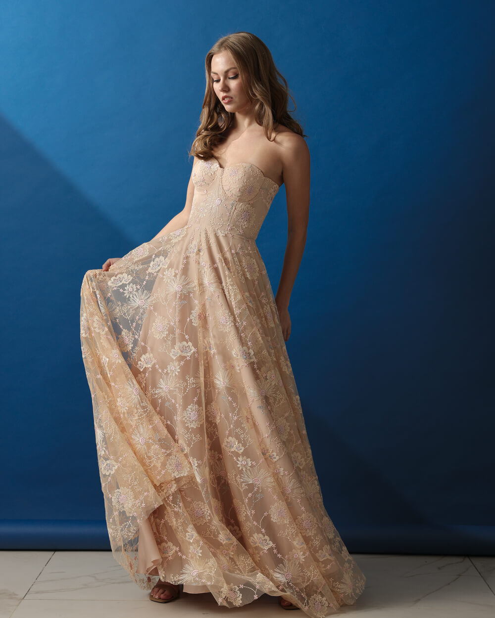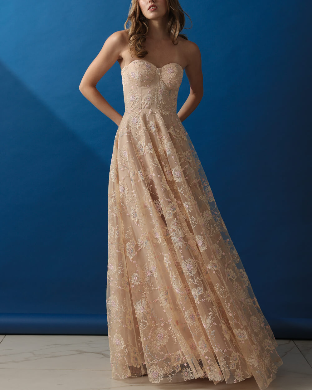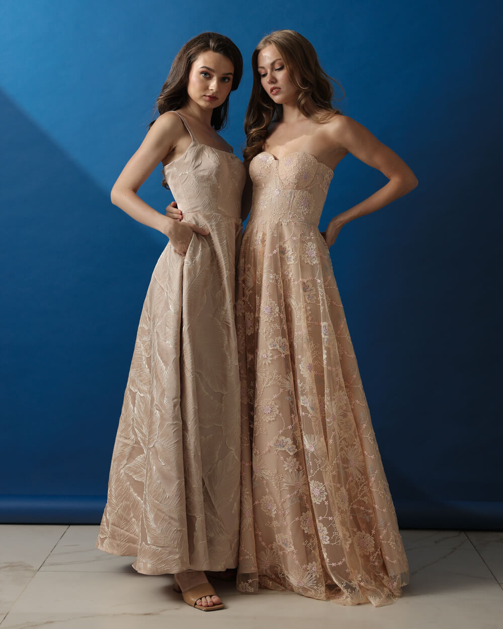 Champagne and blush floral embroidered gown with corseted bodice and full bias cut skirt