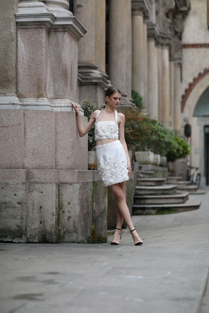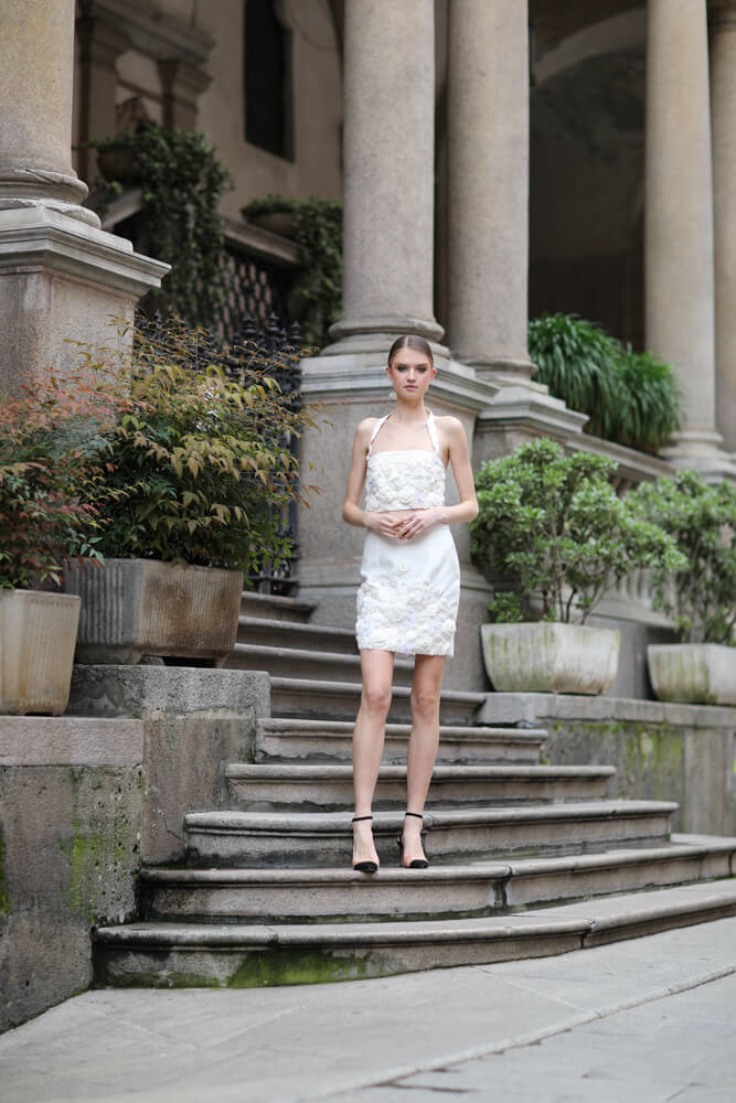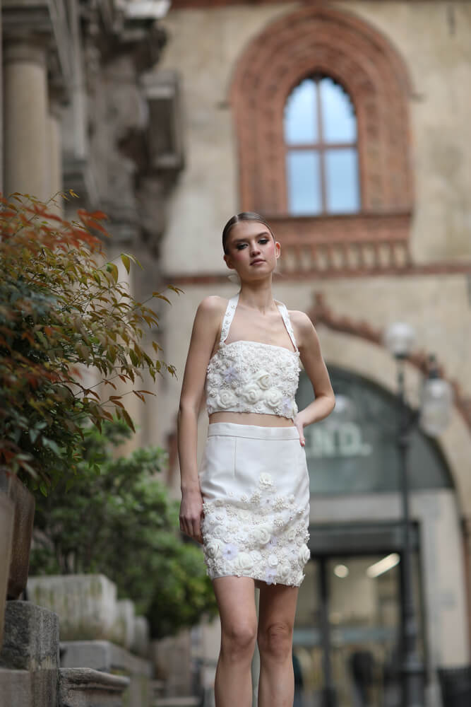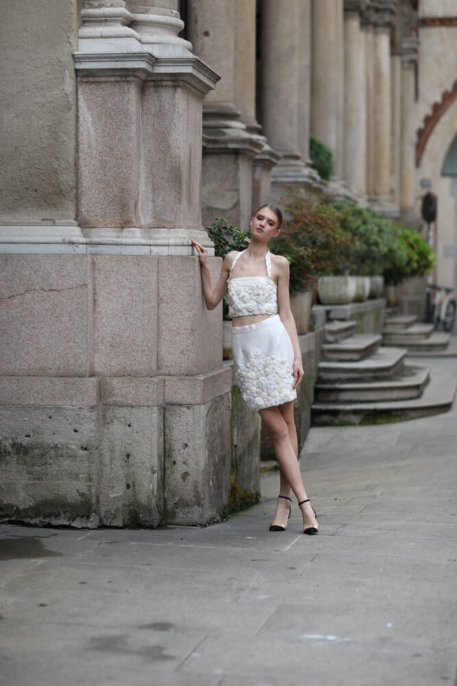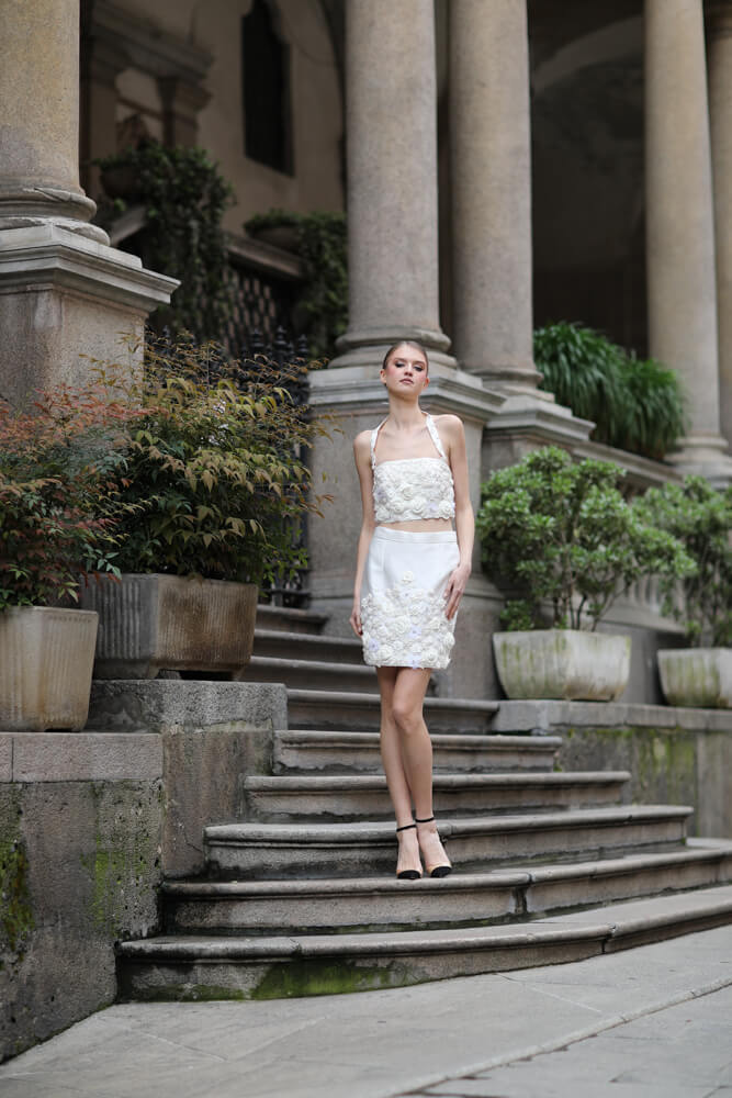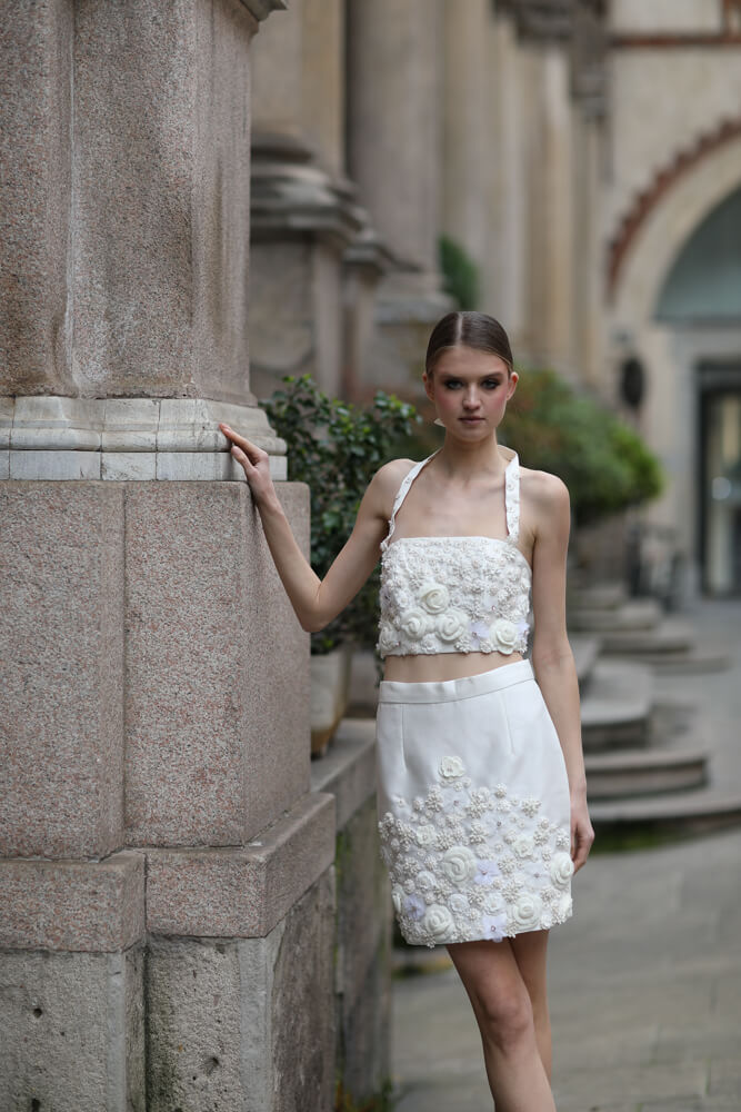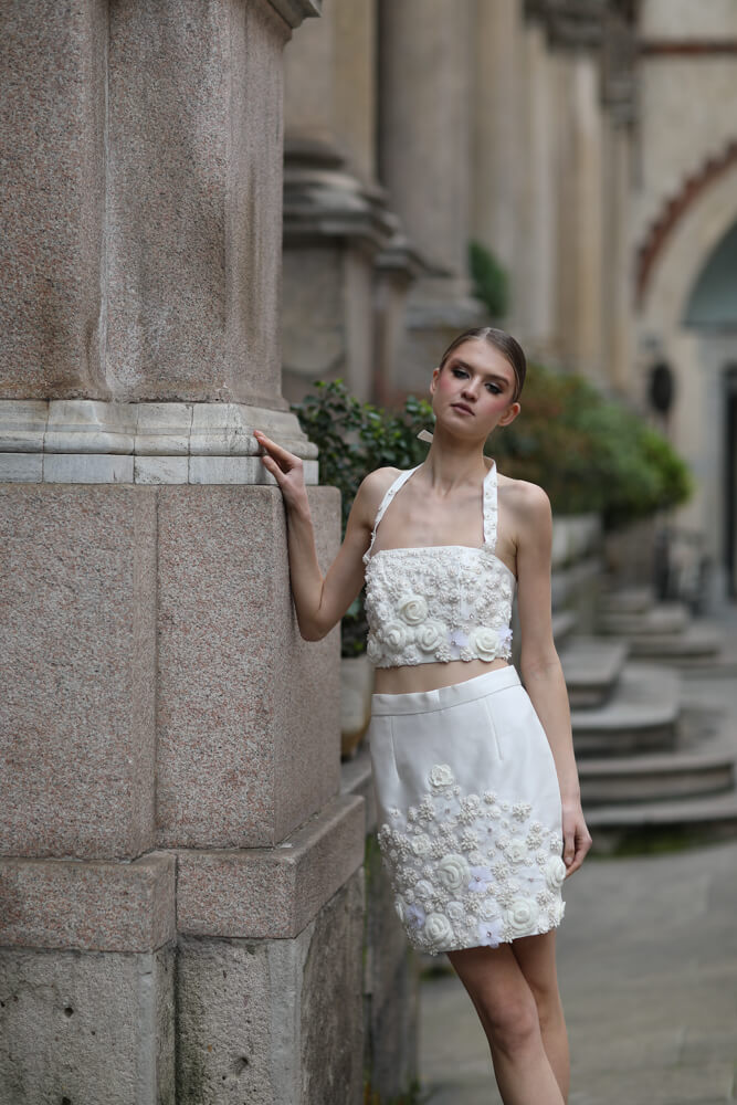 White silk coordinated cropped top with pencil cut mini skirt embellished with 3D floral appliques