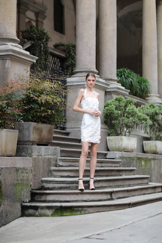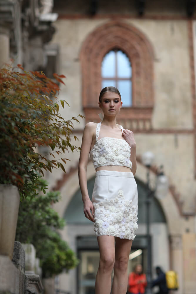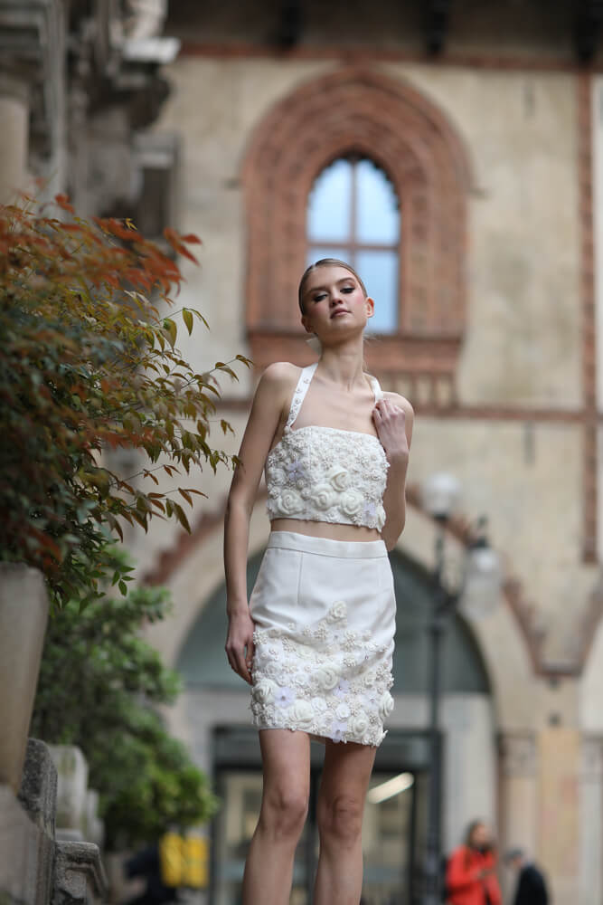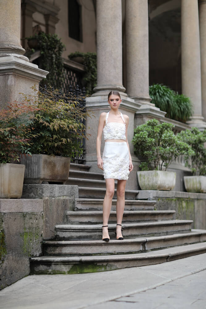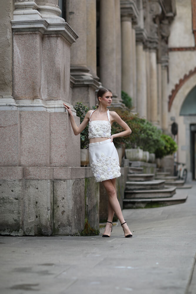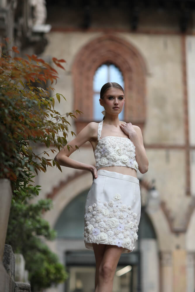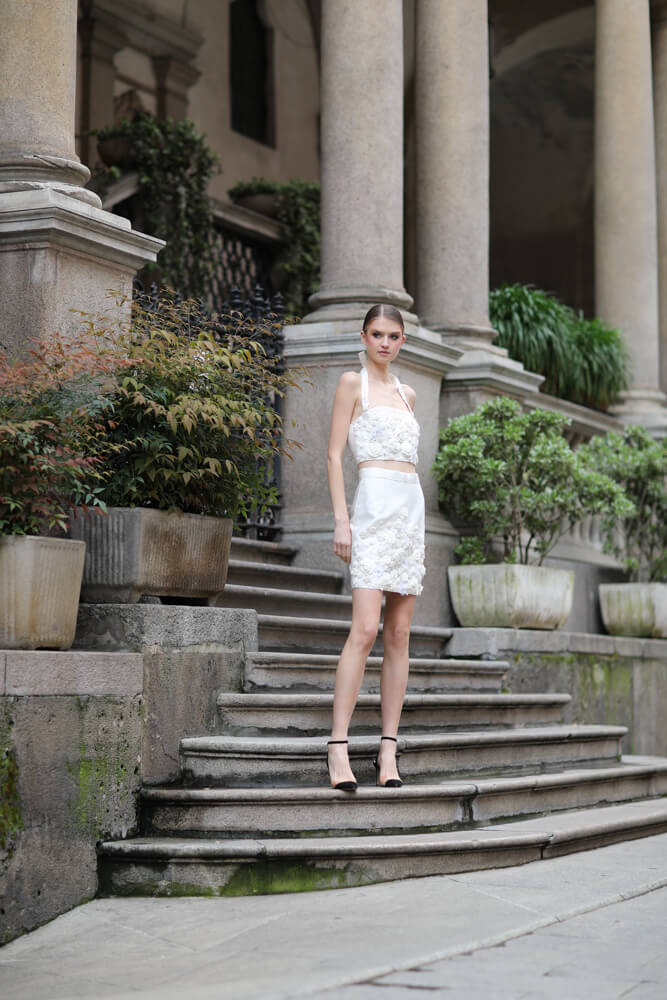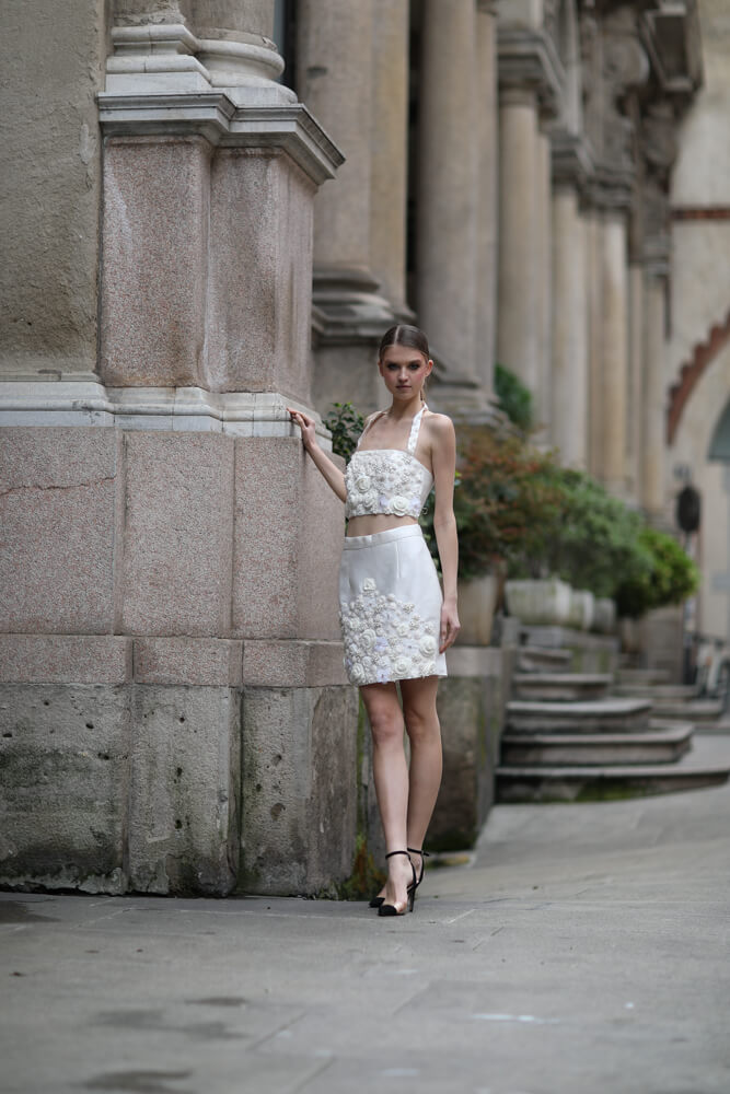 White silk coordinated cropped top with pencil cut mini skirt embellished with 3D floral appliques