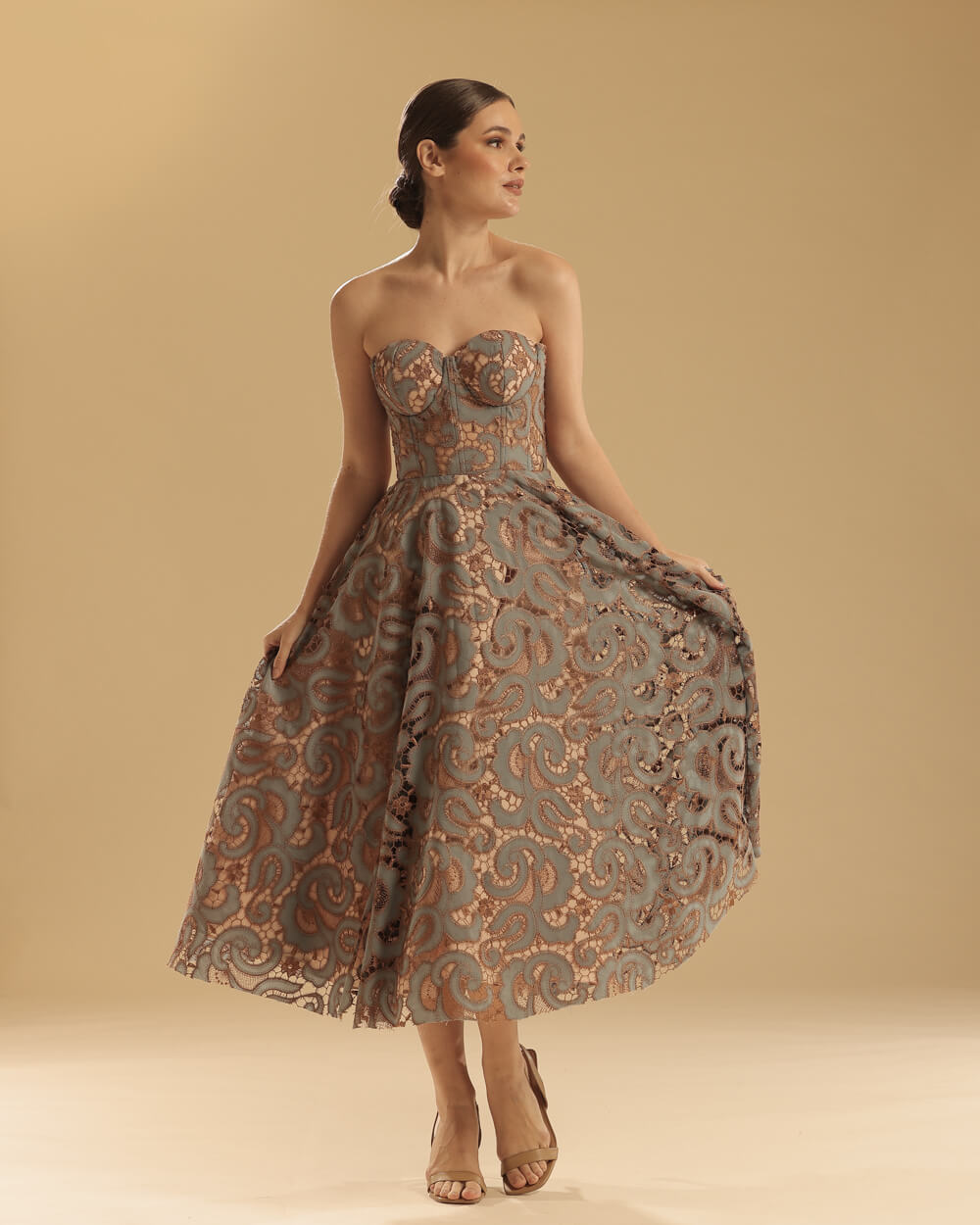 Dusty blue lace corseted bias cut midi dress