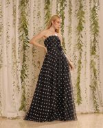 Black and white polka dot silk organdy long gown with flap detail on the tube bodice and bias cut skirt with sash and floral applique
