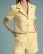 Yellow tweed coordinated crop top with collar and short sleeves and shorts with pockets