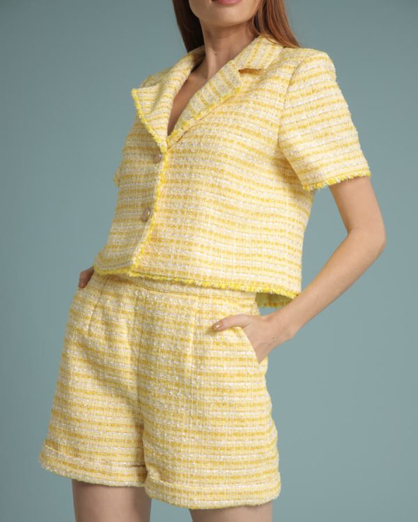 Yellow tweed coordinated crop top with collar and short sleeves and shorts with pockets