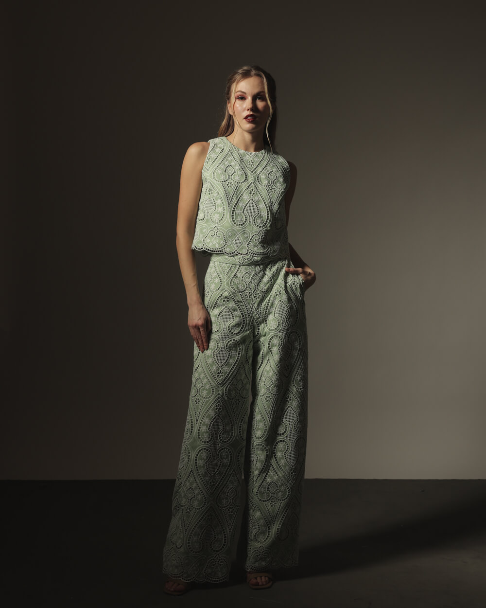 Mint green floral eyelet coordinated semi-haltered top and trousers