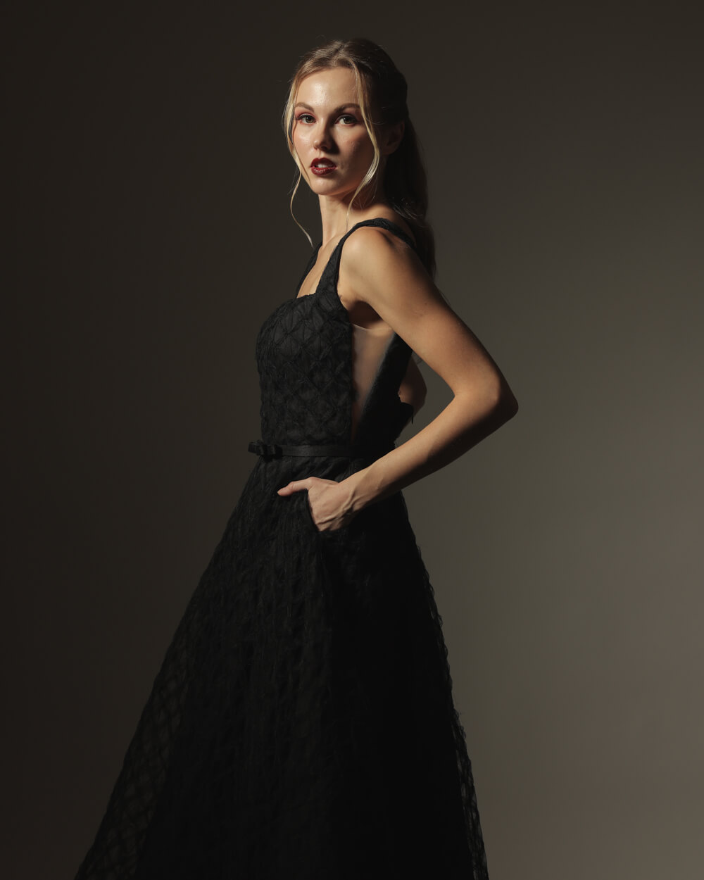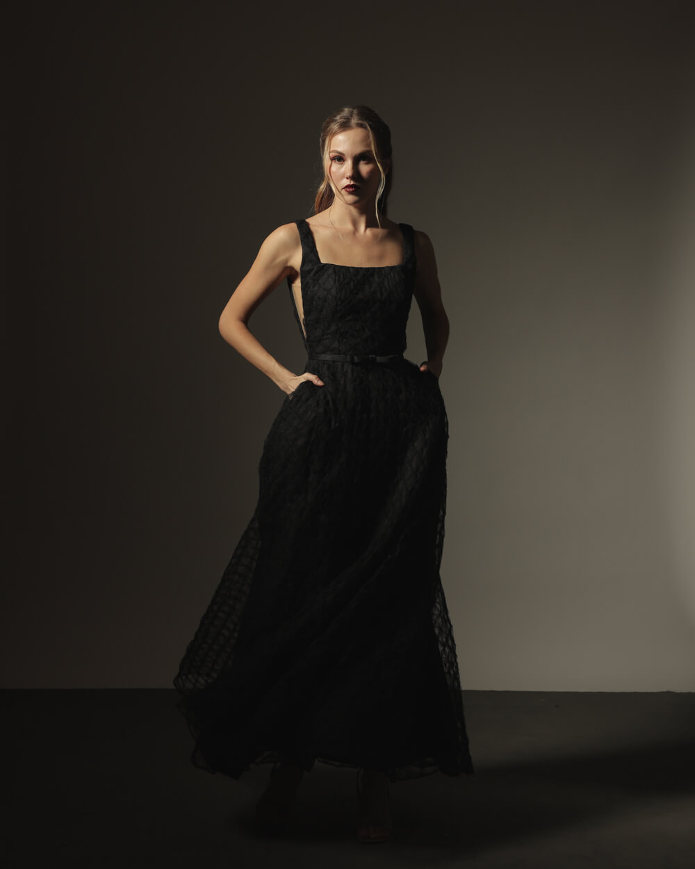 Black textured tulle long gown with scoop neckline with bias cut skirt with sheer illusion tulle on the side