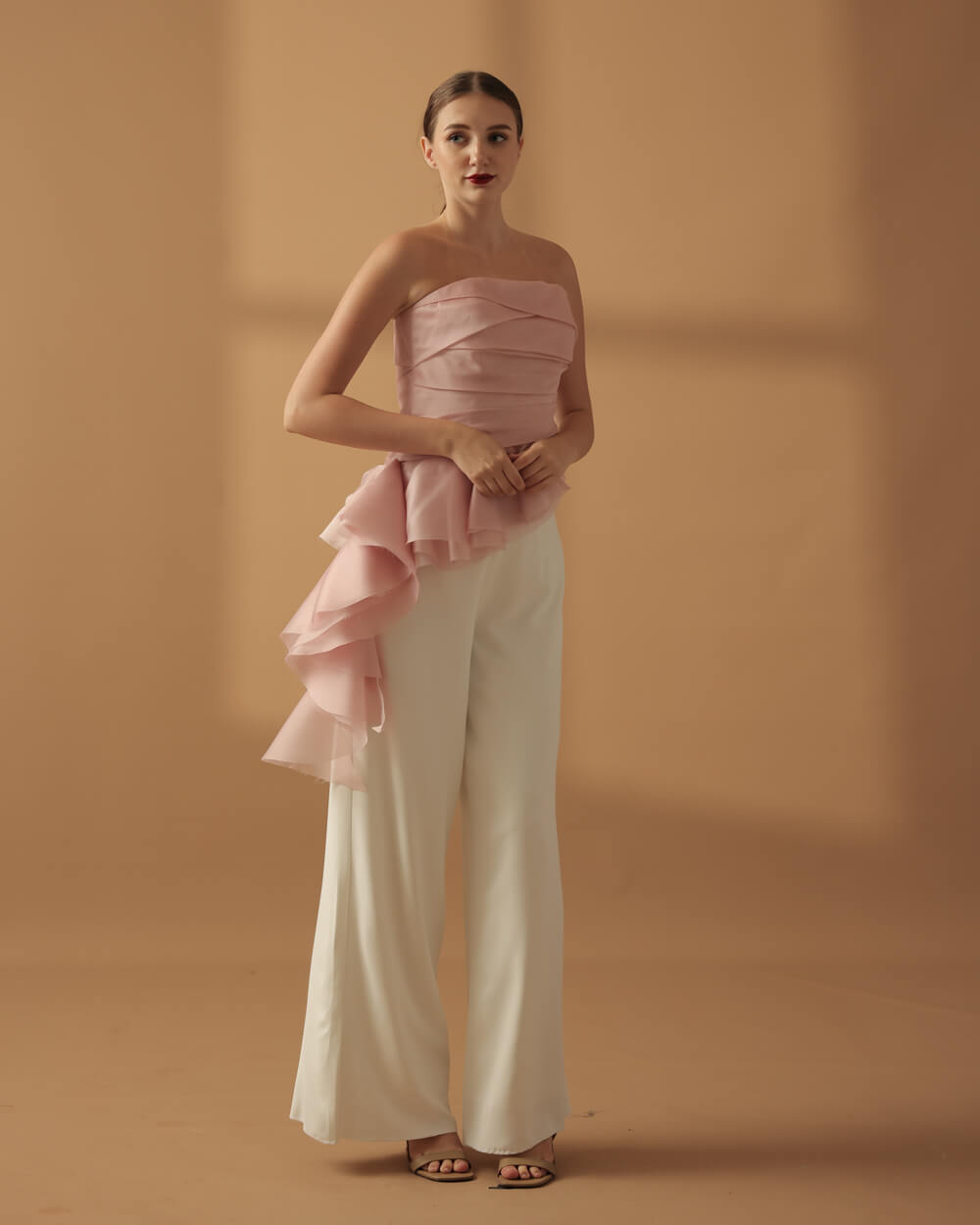 Blush pleated silk organdy top with cascading ruffle detail