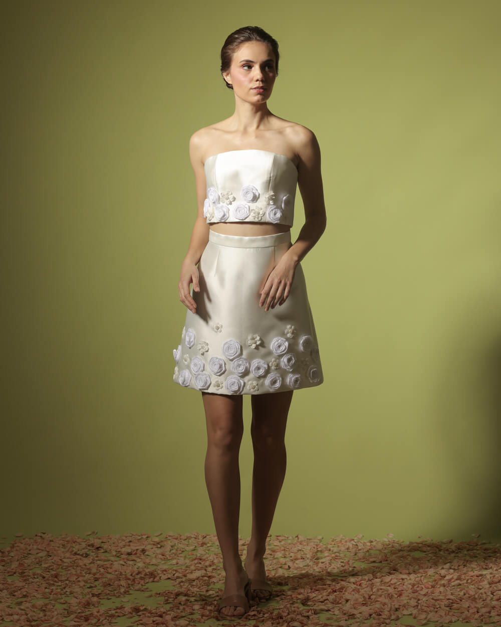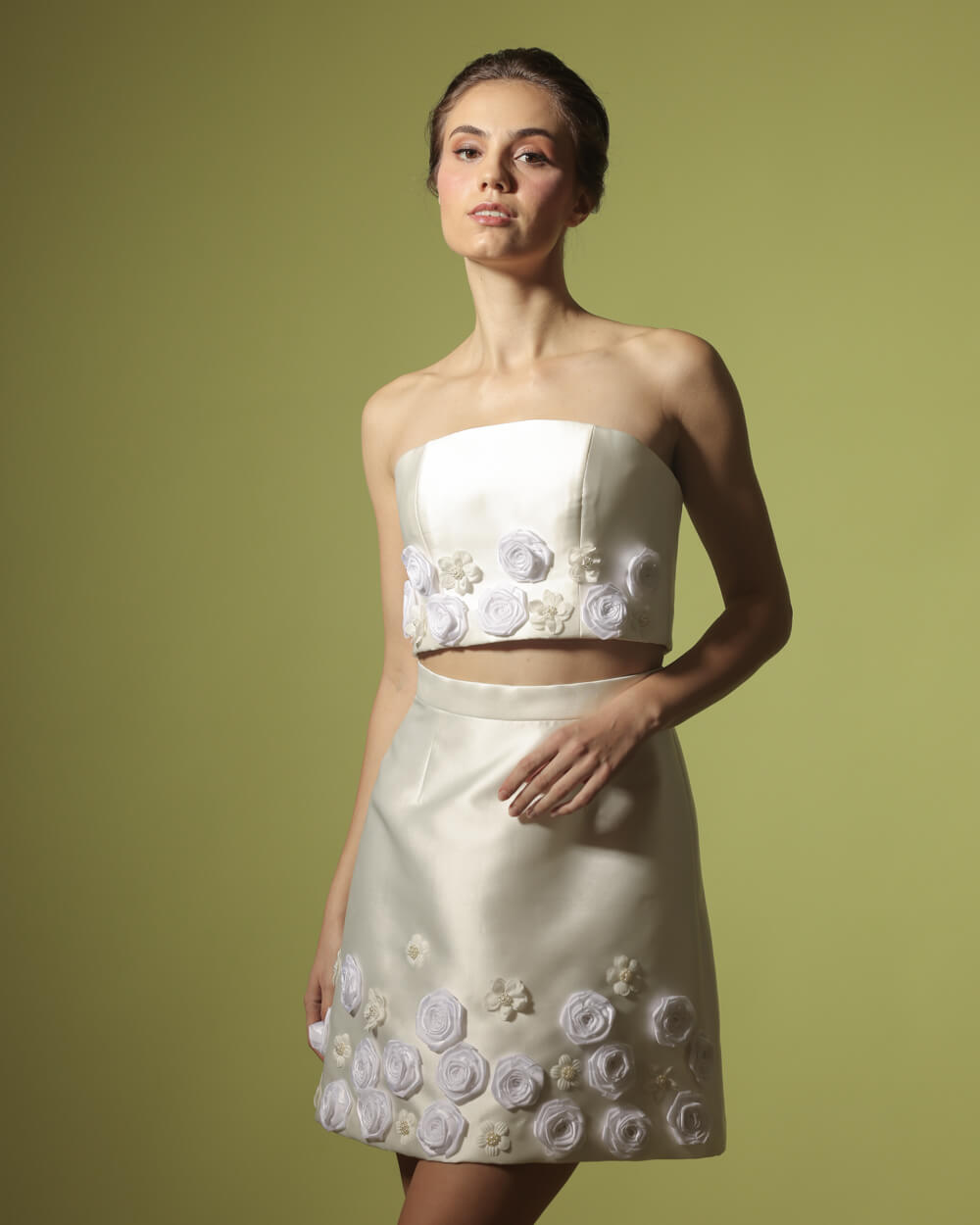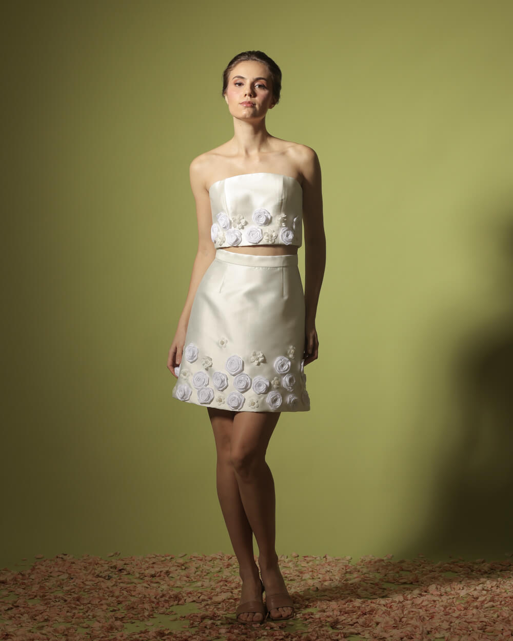 White Mikado silk coordinated corseted bustier cropped top with mini A-line skirt embellished with rosettes