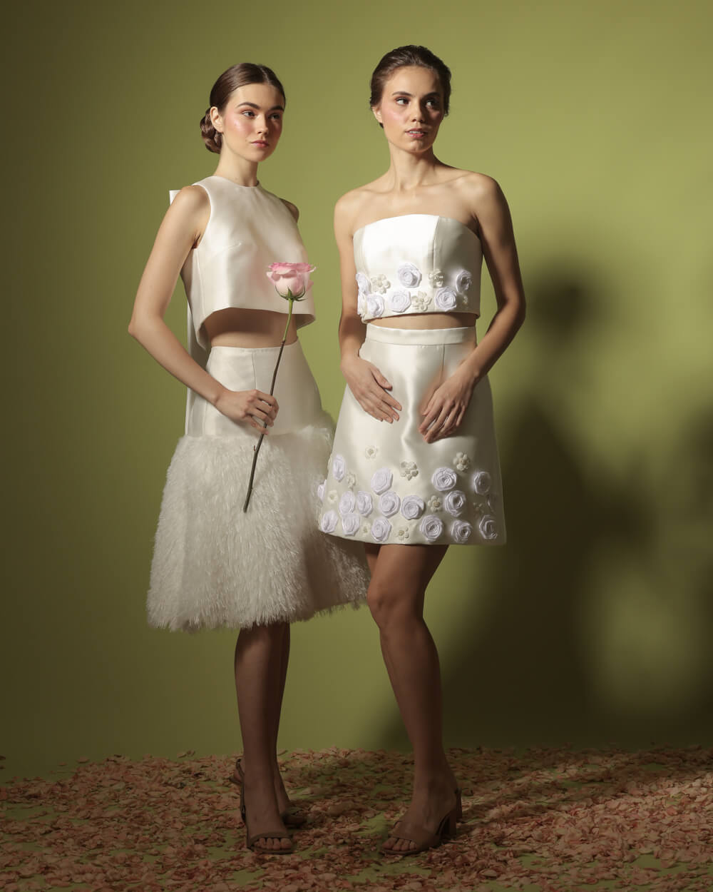 Tags: A line skirt, Appliques, Bustier, Corset, Cropped top, Floral, Mikado Silk, Mini Skirt, Rosettes, Spring Summer 2026, SS2026, White, White Coords