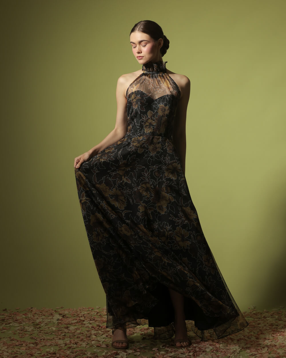 Tags: Black and Yellow, Floral, Full bias cut skirt, Gown, Halter, Haltered, Long Gown, Silk organdy, Spring Summer 2026, SS2026