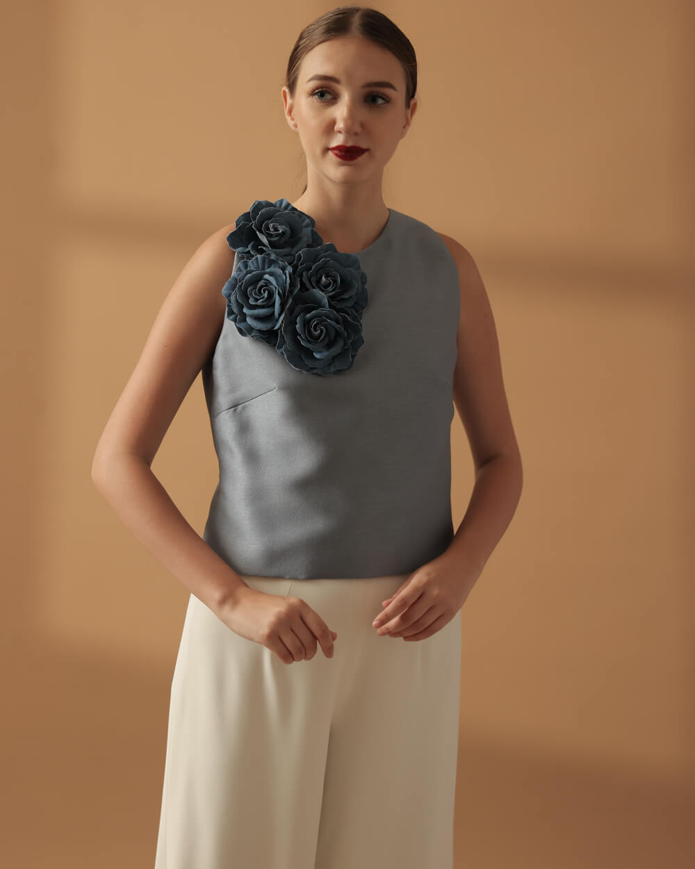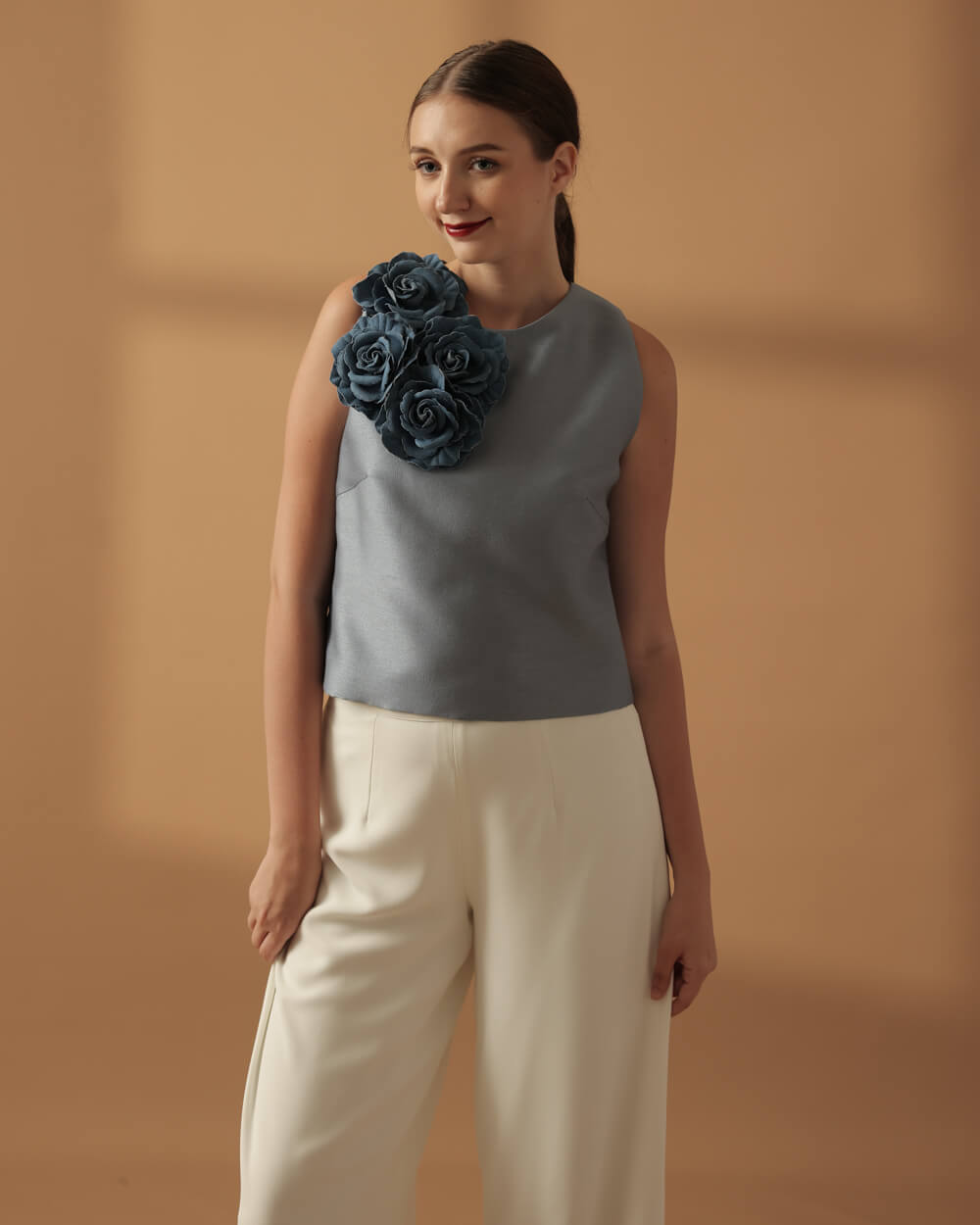 Dusty blue silk semi-haltered top embellished with 3d rosette appliques