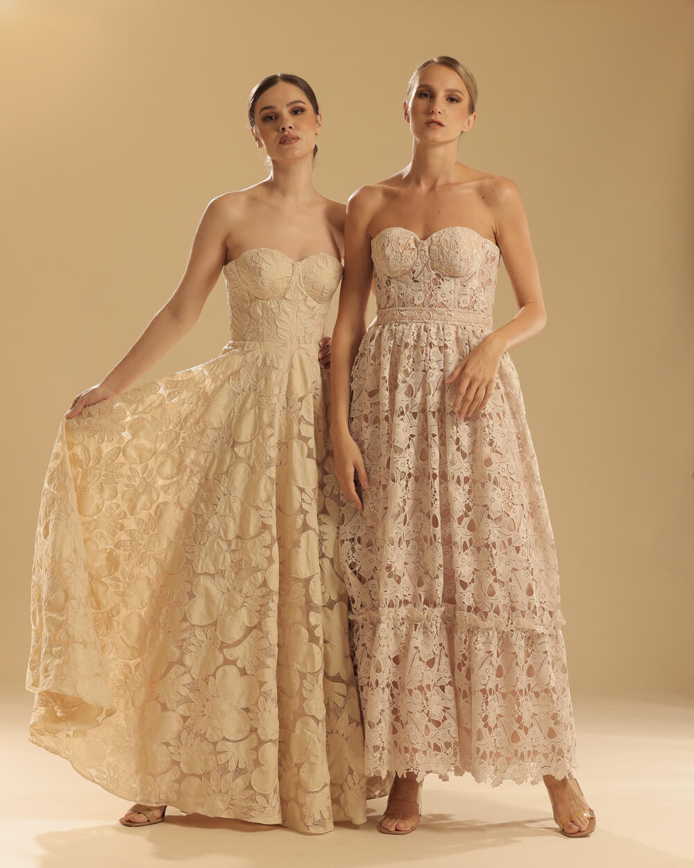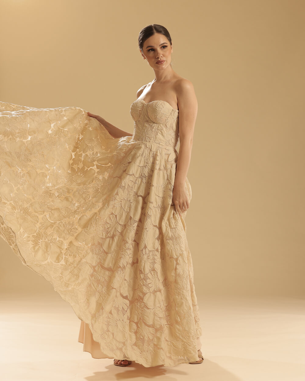 Cream floral lace corseted long gown with bias cut skirt with secret side pockets
