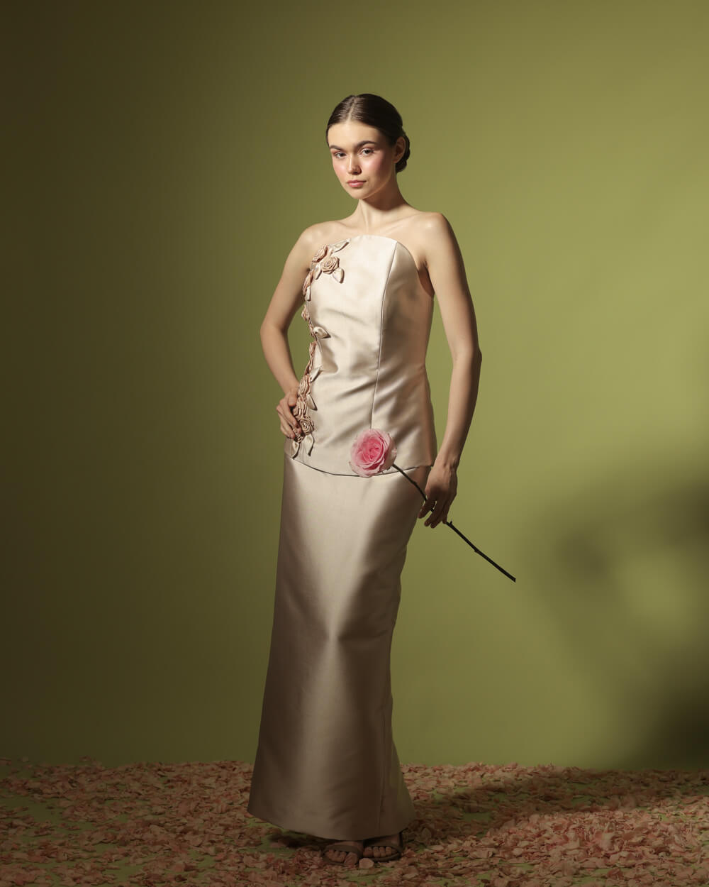 Tan Mikado silk coordinated corseted structured top embellished with rosette details with floor length pencil cut skirt