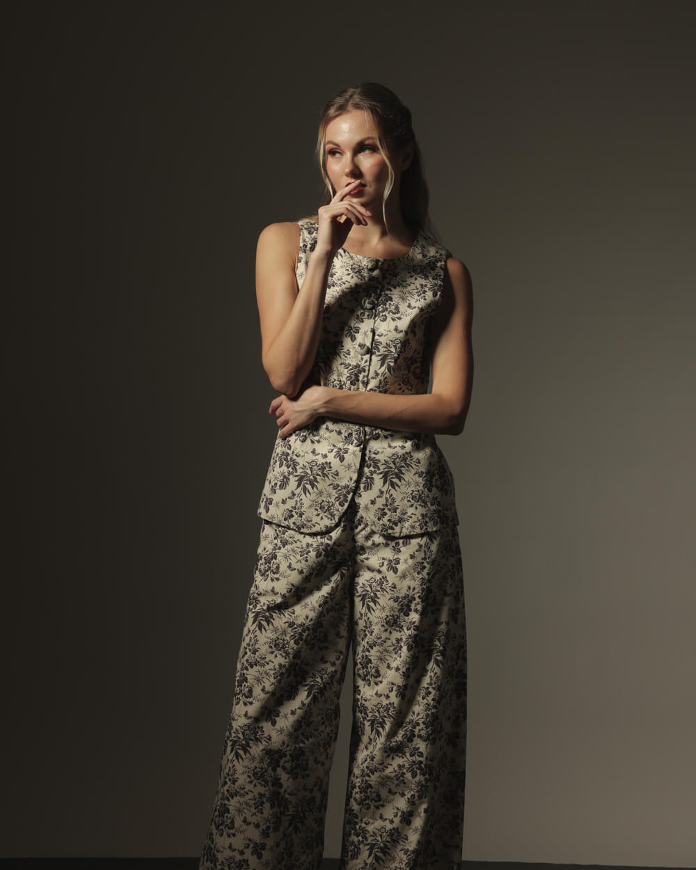 Cream and black floral printed coordinated long vest with trousers