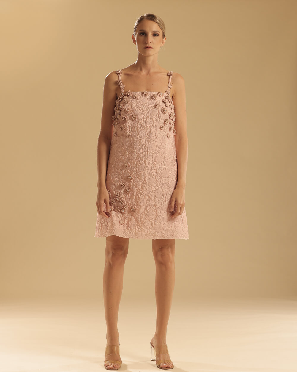 Tags: 3D, Appliques, Blush dress, Floral, Mini Dress, Sheath dress, Silk, Spring Summer 2024, SS2024, Textured