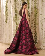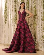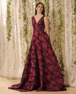 Long gown with sleeveless deep V neckline in magenta floral silk brocade gown with bias cut skirt