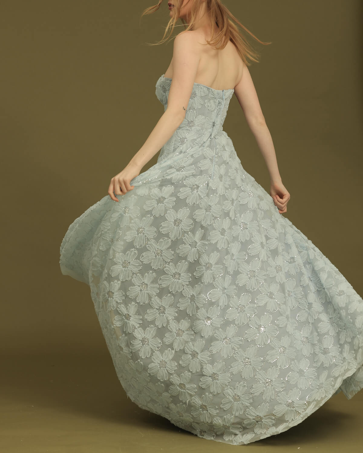 Tags: Beaded, Bustier, Corset, Embellished, Flora, Full bias cut skirt, Holiday 2024, Holiday Collection, Long Gown, Powder Blue, Powder blue gown