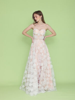 Pastel floral duchess satin corseted bustier floor length gown with sheer detail on the bodice and pencil cut skirt with center back slit