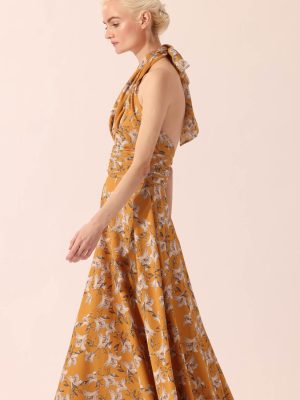 Asymmetrical ivory Mikado silk gown embellished with exaggerated floral laser cut appliques with gold beads and crystals