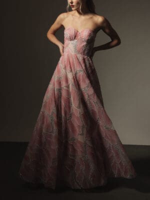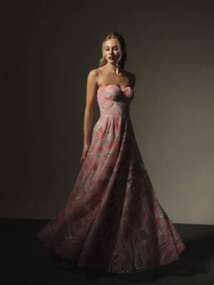 Rose pink and cream floral silk printed coordinated haltered peplum top and full bias floor length skirt