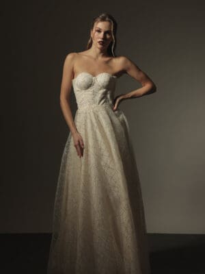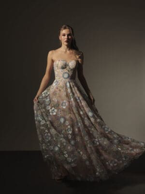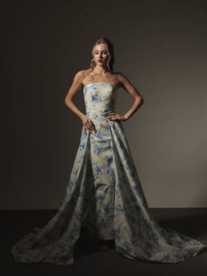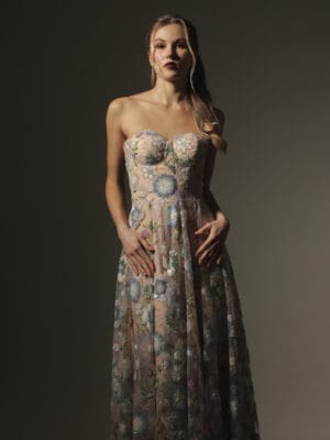 Yellow, cream and marigold floral lace beaded corseted bustier long gown with column cut skirt with detachable cape skirt