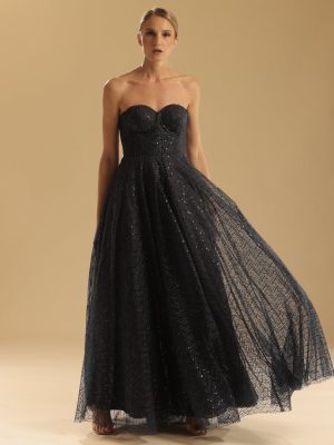 Midnight blue and pink floral silk brocade coordinated tube top and floor length bias cut skirt with secret side pockets