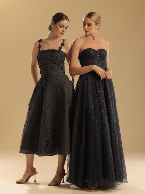 Black paisley/ floral lace midi dress with semi-haltered neckline and A-line skirt with sheer detail (on nude lining)