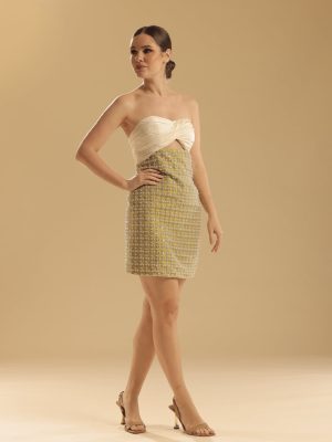 2-toned silk mini dress in ivory and lime with ruched neckline and embellished pencil cut skirt; with cut out detail