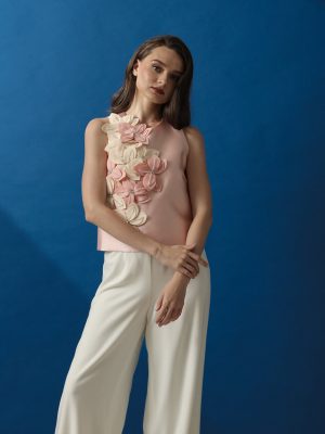 Blush pink Mikado silk semi-haltered top embellished with 2-toned floral embellishments