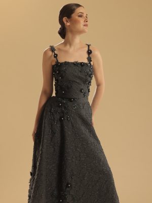 Midnight blue silk coordinated cropped top and bias cut midi skirt embellished with 3d floral appliques; with secret side pockets