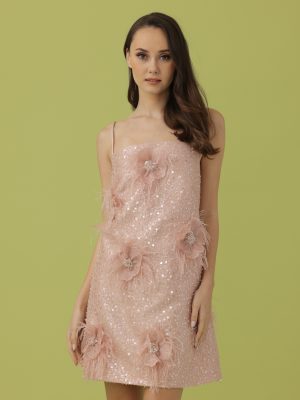 Blush fully embellished mini sheath dress with spaghetti straps and embellished with 3D floral lace appliques with crystals and feathers