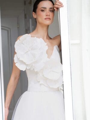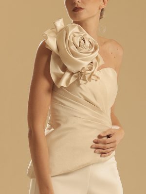 Asymmetrical ivory Mikado silk gown embellished with exaggerated floral laser cut appliques with gold beads and crystals