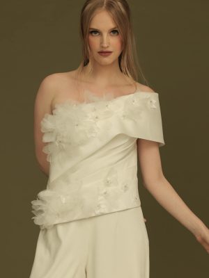 White Mikado Silk corseted bustier statement top embellished with 3D floral laser cut appliques with beads and crystals