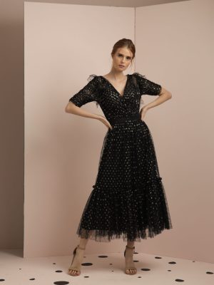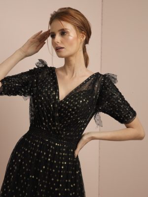Tea length black and gold polka dot tulle with ruched bodice, V-neckline, sheer details and short sleeves with ruffles; full bias gathered skirt with ruffled hem and lace trimmings on the waist band