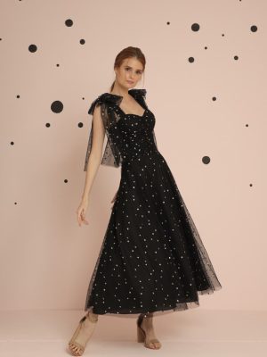 Black and gold polka dot tulle tea length dress with corseted ruched bodice with bows on the shoulder and full bias gathered skirt