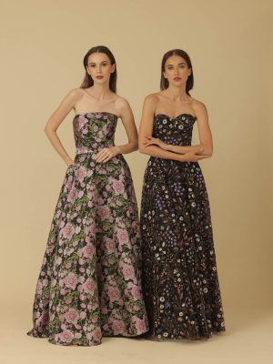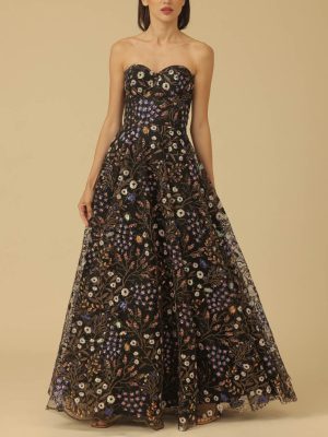 Black multi-coloured floral tulle long gown with sweet heart neckline and ruched bodice, bias skirt and off shoulder puff sleeve detail