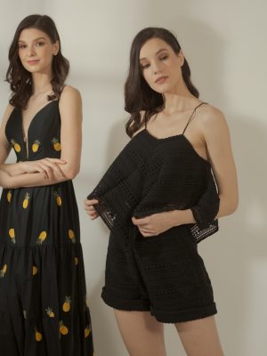 Maxi dress in black pure linen with pineapple embroidery with v neckline and spaghetti straps and tiered skirt