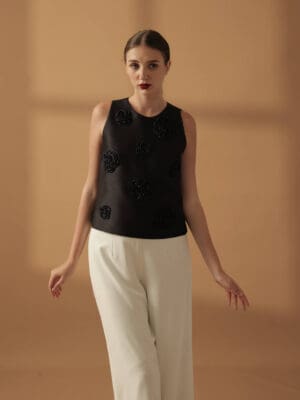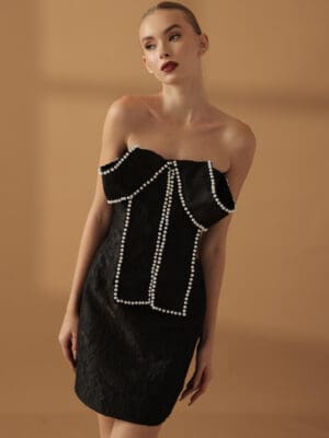 Black Mikado silk mini dress with flap detail, spaghetti straps and A-line skirt embellished with crystal bows