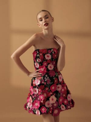 Black Mikado silk corseted bustier mini dress with tulip skirt embellished wilk silk floral appliques with pearls