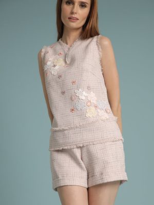 Blush pink silk gazar coordinated embellished top with scoop neckline and bow details and straight cut pants