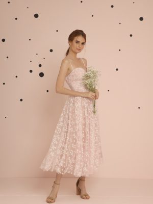 Blush floral metallic tulle tea length dress with ruched bodice and spaghetti straps; full bias gathered skirt
