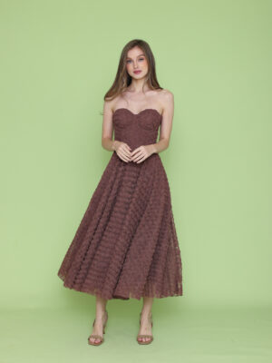 Chocolate brown floral textured tulle corseted bustier midi dress with bias cut skirt