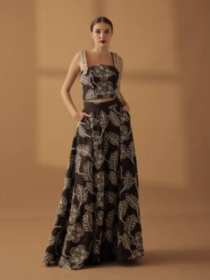 Coffee floral embroidered cropped top with trimming details as straps and full bias cut skirt with secret side pockets